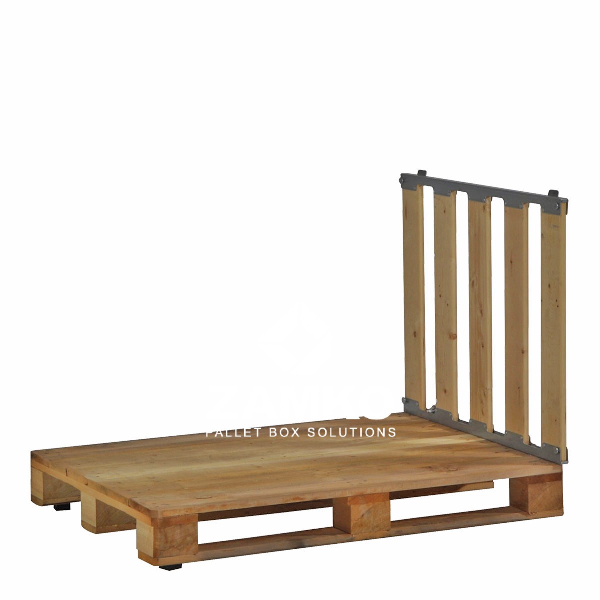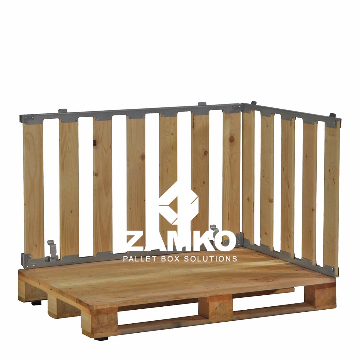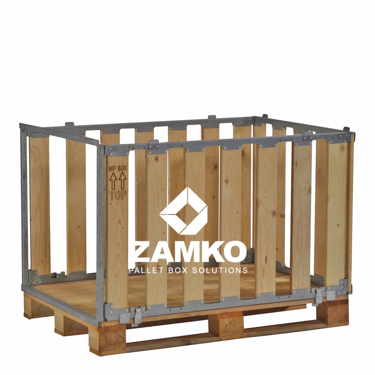This MP Box is a collapsible/foldable pallet cage of reliable and solid construction which consists of four detachable walls fixed to a Europallet. This version is open on two short sides. The four walls are put together sturdily with centering pins and are fastened to the pallet with four bench hooks.