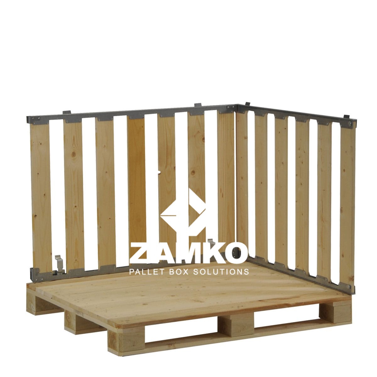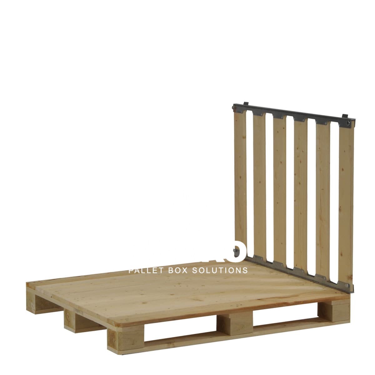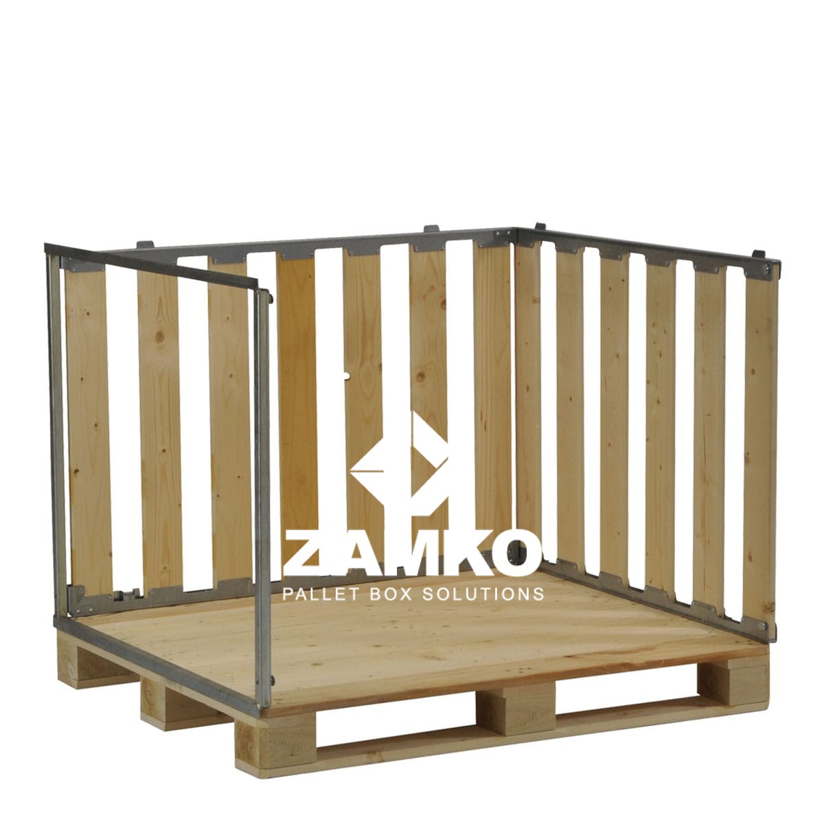 This MP Box is a collapsible/foldable pallet cage of reliable and solid construction which consists of four detachable walls fixed to a 1200x1000mm pallet. This version is open on one short side. The four walls are put together sturdily with centering pins and are fastened to the pallet with four bench hooks.