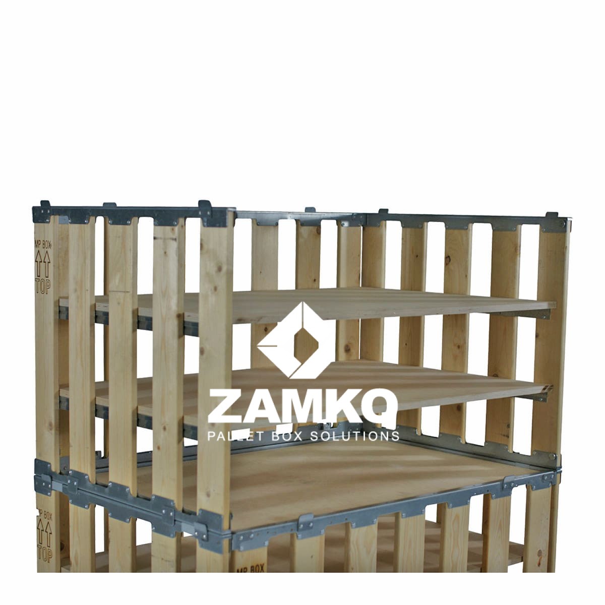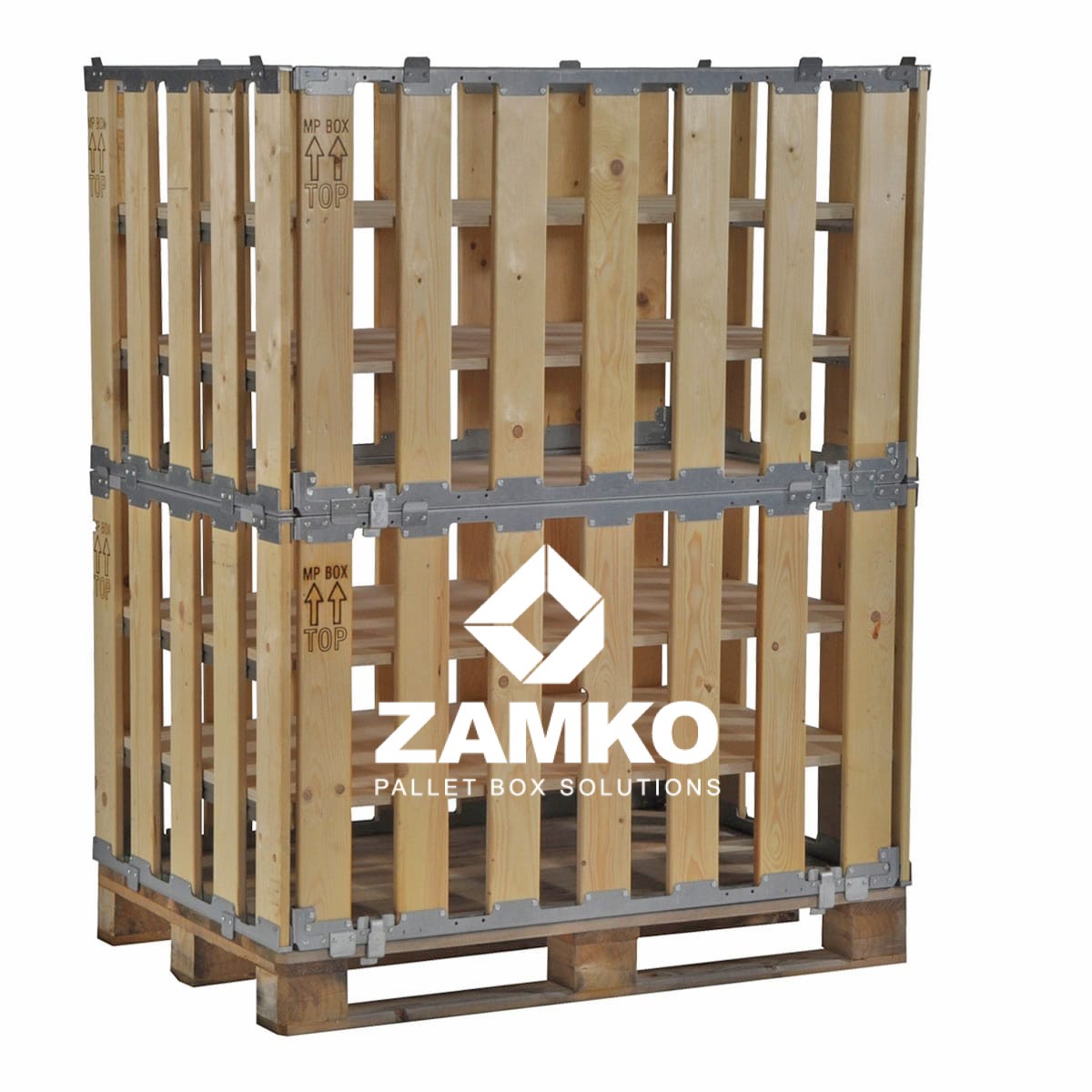 This MP Box is a collapsible/foldable pallet cage of reliable and solid construction which consists of eight detachable walls fixed to a 1200x1000mm pallet. This version has shelves. The eight walls are put together sturdily with centering pins and are fastened to each other and the pallet with four bench hooks.