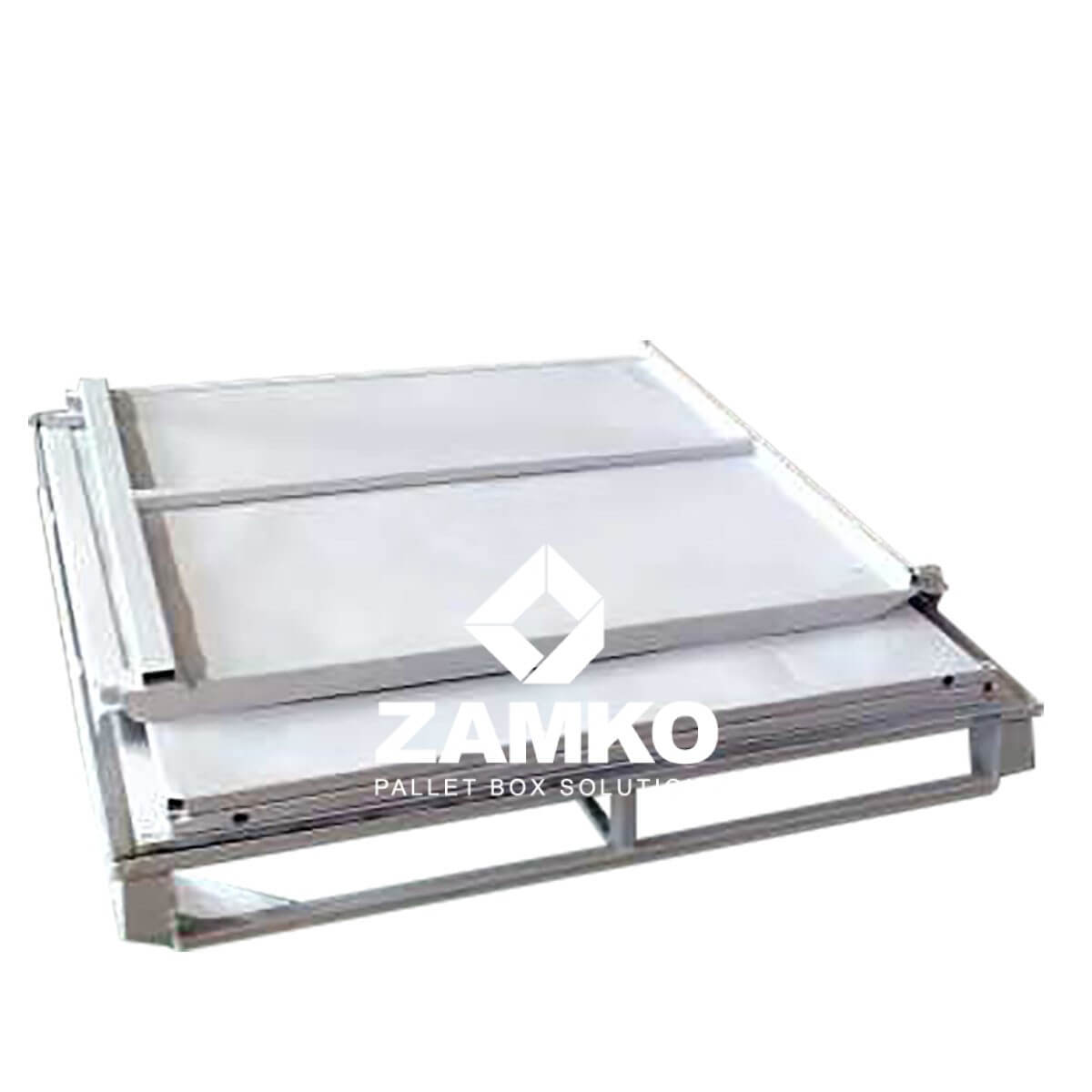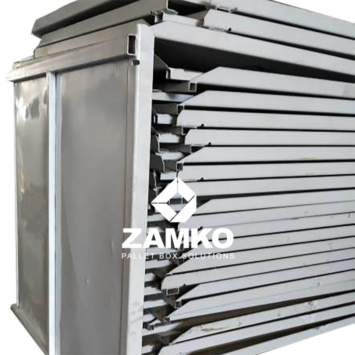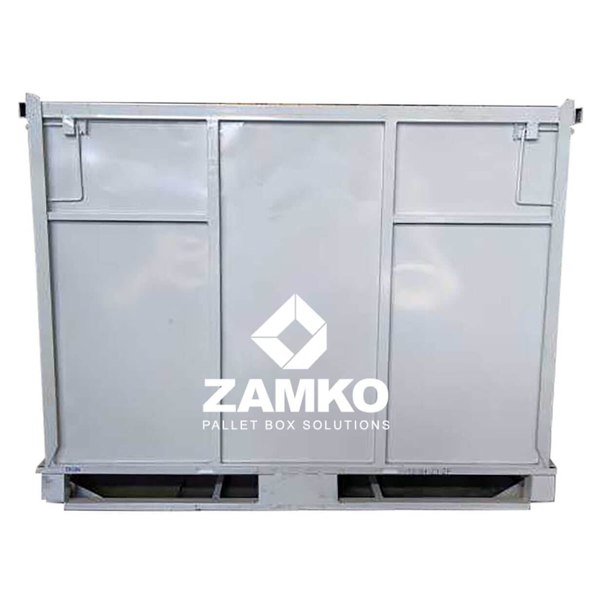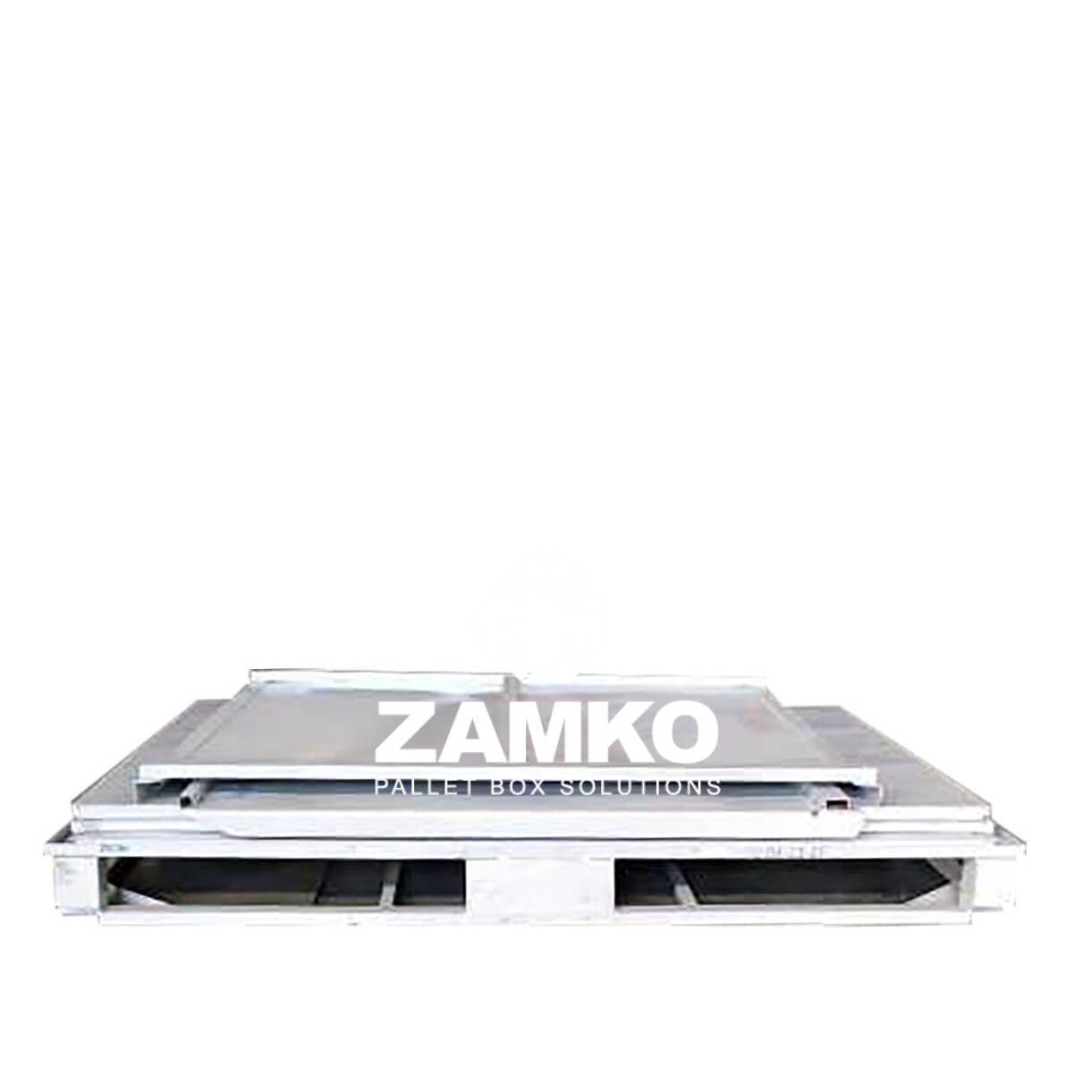 Closed steel pallet box in dimensions 800x1200mm with a unique Walk-In structure. One wall can be fully removed during (un-)loading. Relatively light weight.