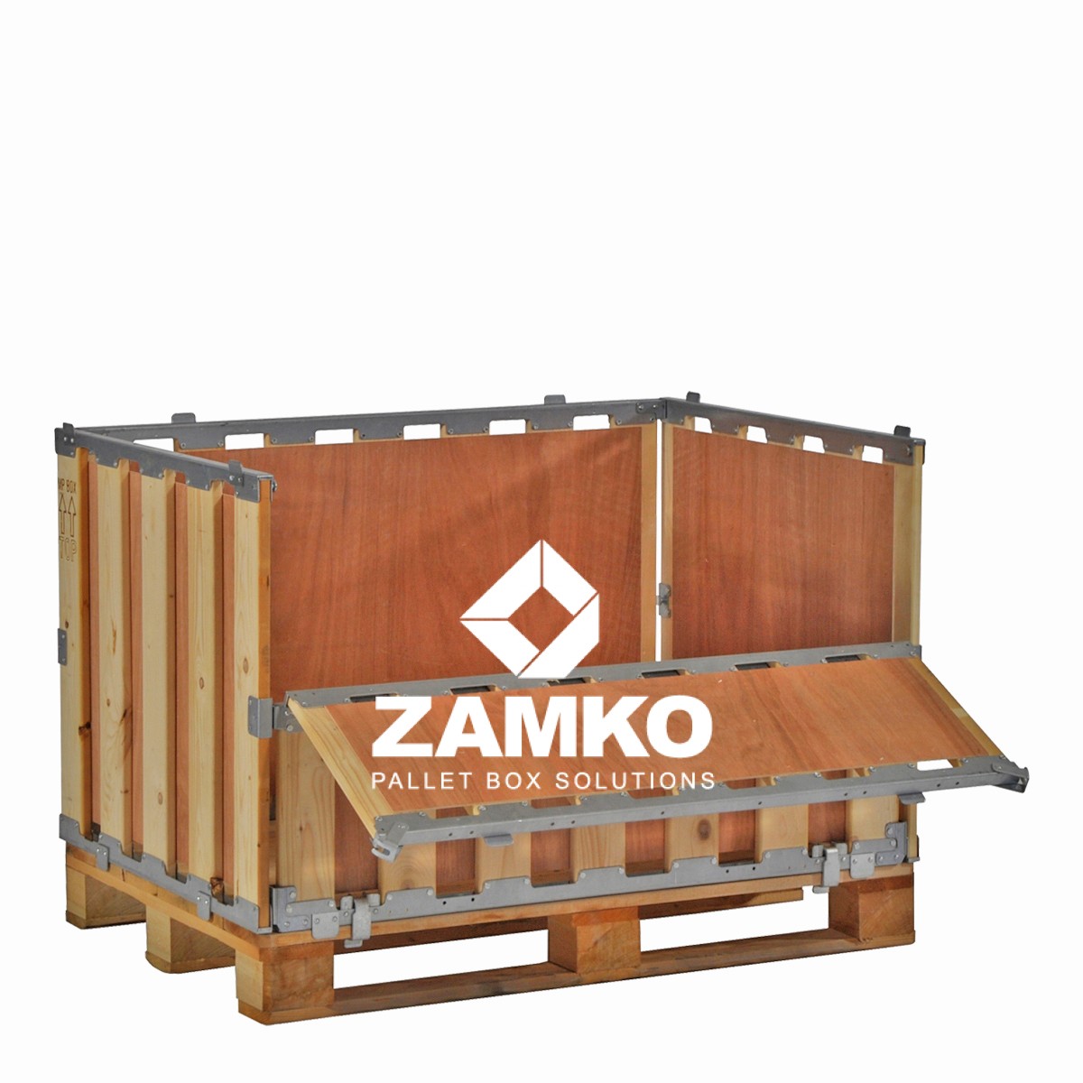 The 4 walls with one hinged gate oin the long side, closed with plywood on each wall. For return logistics: 16 boxes per pallet location. Storage: 40 boxes per pallet location.