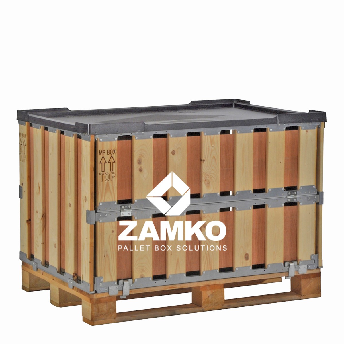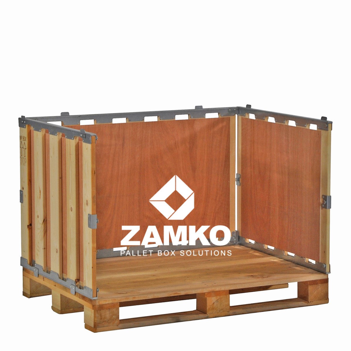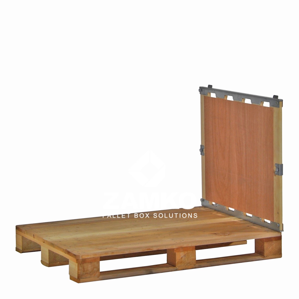 This MP Box is a collapsible/foldable pallet cage of reliable and solid construction which consists of four detachable closed walls fixed to a Europallet. One long wall has a folding window. The inside is closed with plywood .The four walls are put together sturdily with centering pins and are fastened to the pallet with four bench hooks.